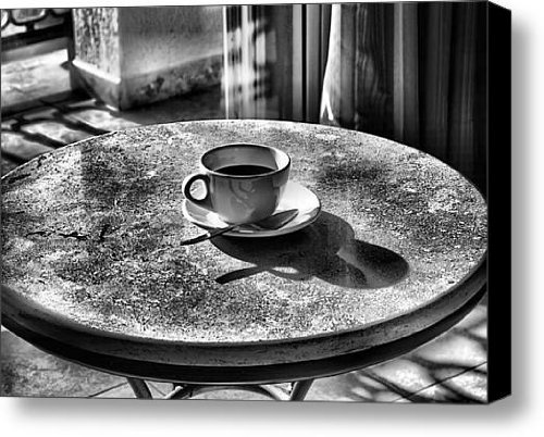 This is a beautiful stretched-canvas print wrapped on 1.5" thick stretcher bars. The print is professionally printed, assembled, and shipped within 2 - 3 business days from our production facility in North Carolina and arrives ready-to-hang on your wall. Fine Art America is home to more than 75,000 artists from all over the world who entrust us to fulfill their print orders online. We offer a 30-day money-back guarantee on every print that we sell and look forward to helping you select your next piece. Keywords: Coffee Canvas Print, Coffee Cup Canvas Print, Table Canvas Print, Round Table Canvas Print, Black And White Canvas Print