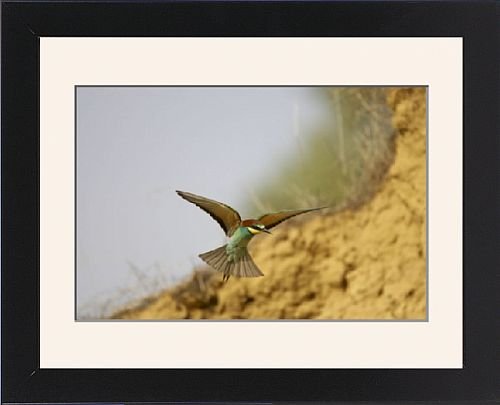 14 x11 Framed Print, Black Satin Frame Off-White Digital Mat. showing Bee-eater - Coming in to land on perch. COS-975 Bee-eater - Coming in to land on perch Extramadura, Spain Merops apiaster Bill Coster Please note that prints are for personal display purposes only and may not be reproduced in any way. prints ardea 44 (0) 20 8672 2067. Chosen by Ardea Wildlife Pets. 14 x11 wooden frame with digital mat and RA4 print. Finished back including