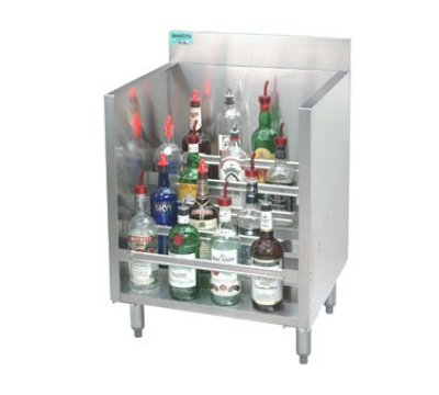 Challenger Liquor Display Rack, 18" long x 21" deep, 4" splash, five tiered steps each with 5-bottle capacity, stainless steel construction, stainless steel legs with adjustable feet